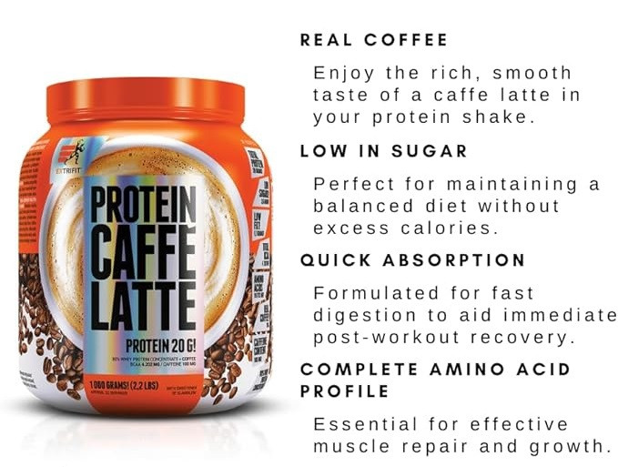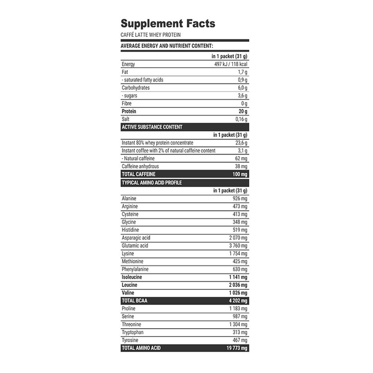- اگر عاشق قهوه خوشمزه و در عین حال ورزشکار هستید، پس CAFFÉ LATTE WHEY PROTEIN 80 برای شما مناسب است! این پروتئین وی عالی با طعمی عالی، حاوی 10٪ قهوه واقعی و 100 میلیگرم کافئین، یک نوشیدنی ورزشی بینظیر است که در هر دوز، 20 گرم پروتئین به بدن شما میرساند و علاوه بر این، از قهوه کفکرده بسیار خوشمزه با اثر تحریککننده لذت میبرید.
