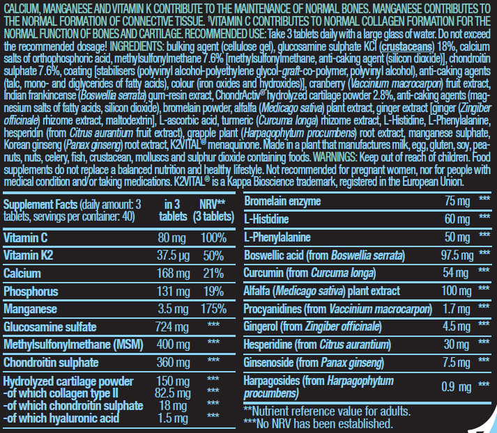 عامل حجم دهنده (ژل سلولز)، گلوکزامین سولفات KCl ( سخت پوستان ) ۱۸٪، نمکهای کلسیم اسید ارتوفسفریک، متیل سولفونیل متان ۷.۶٪ [متیل سولفونیل متان، عامل ضد کلوخه شدن (دی اکسید سیلیکون)]، کندرویتین سولفات ۷.۶٪، پوشش [تثبیت کنندهها (پلی وینیل الکل-پلی اتیلن گلیکول-پیوند-کو-پلیمر، پلی وینیل الکل)، عوامل ضد کلوخه شدن (تالک، مونو و دی گلیسیرید اسیدهای چرب)، رنگ (اکسیدها و هیدروکسیدهای آهن)]، عصاره میوه کرنبری (Vaccinium macrocarpon)، عصاره صمغ-رزین کندر هندی (Boswellia serrata)، پودر غضروف هیدرولیز شده ChondrActiv® ۲.۸٪، عوامل ضد کلوخه شدن (نمکهای منیزیم اسیدهای چرب، دی اکسید سیلیکون)، پودر بروملین، عصاره گیاه یونجه (Medicago sativa)، عصاره زنجبیل [زنجبیل] عصاره ریزوم (Zingiber officinale)، مالتودکسترین، اسید اسکوربیک L، عصاره ریزوم زردچوبه (Curcuma longa)، L-هیستیدین، L-فنیلآلانین، هسپریدین (از عصاره میوه بهارنارنج)، عصاره ریشه گیاه گراپل (Harpagophytum procumbens)، سولفات منگنز، عصاره ریشه جینسینگ کرهای (Panax ginseng)، مناکینون K2VITAL®. ساخته شده در گیاهی که شیر، تخم مرغ، گلوتن، سویا، نخود فرنگی، آجیل، کرفس، ماهی، سخت پوستان، نرم تنان و غذاهای حاوی دی اکسید گوگرد تولید میکند.