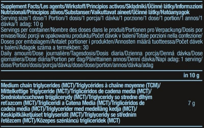 ترکیبات: پودر روغن MCT 99.7٪ [تری گلیسیرید با زنجیره متوسط، عامل حجم دهنده (صمغ عربی)، عامل ضد کلوخه شدن (دی اکسید سیلیکون)]، عامل ضد کلوخه شدن (دی اکسید سیلیکون).