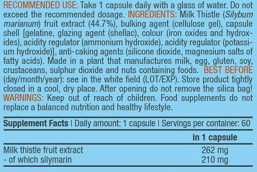 - ۱ وعده: ۲۶۲ میلیگرم عصاره میوه خار مریم (از جمله ۲۱۰ میلیگرم سیلیمارین)