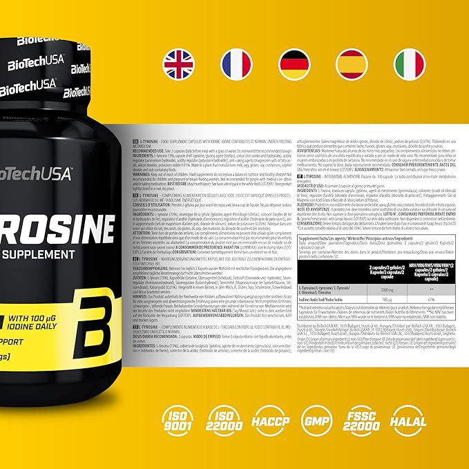 - 🔬 کیفیت قابل اعتماد: BioTechUSA برای رفاه شما، مواد اولیه ایمن و با دقت انتخاب شده را در هر کپسول L-Tyrosine تضمین میکند. توصیه میکنیم روزانه دو کپسول مصرف کنید.