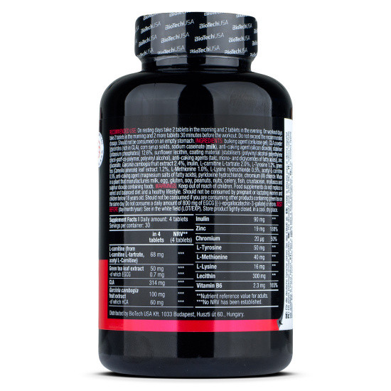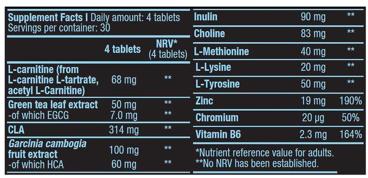 | مواد تشکیل دهنده / سایر مواد تشکیل دهنده: عامل حجم دهنده (ژل سلولز)، پودر CLA (گلیسیریدها (غنی از CLA)، مواد جامد شربت ذرت، کازئینات سدیم (شیر)، عامل ضد کلوخه شدن (دی اکسید سیلیکون)، تثبیت کننده (فسفات پتاسیم)) 12.6٪، لسیتین آفتابگردان، مواد پوشش دهنده (تثبیت کننده ها (پلی وینیل الکل-پلی اتیلن گلیکول-پیوند-کو-پلیمر، پلی وینیل الکل)، عوامل ضد کلوخه شدن (تالک، مونو و دی گلیسیرید اسیدهای چرب))، گلوکونات روی، عصاره میوه گارسینیا کامبوجیا 2.4٪، اینولین، ال-کارنیتین ال-تارترات 2.0٪، ال-تیروزین 1.2٪، عصاره برگ چای سبز (کاملیا سیننسیس) 1.2٪، ال-متیونین 1.0٪، ال-لیزین هیدروکلراید 0.5٪، استیل-ال-کارنیتین 0.5٪، عامل ضد کلوخه شدن (نمک های منیزیم اسیدهای چرب)، پیریدوکسین هیدروکلراید، کروم (III) کلرید. | |||
