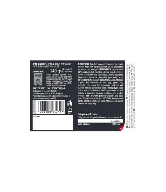 ترکیبات: بتا آلانین ۸۶٪، پوسته کپسول [ژلاتین، عامل لعاب (شلاک)، رنگ (اکسیدها و هیدروکسیدهای آهن)، تنظیمکنندههای اسیدیته (هیدروکسید آمونیوم، هیدروکسید پتاسیم)]، عامل ضد کلوخه شدن (نمکهای منیزیم اسیدهای چرب). ساخته شده در کارخانهای که شیر، تخممرغ، گلوتن، سویا، بادامزمینی، آجیل، کرفس، ماهی، سختپوستان، نرمتنان و غذاهای حاوی دیاکسید گوگرد تولید میکند.