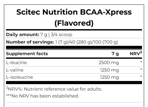 یک وعده (۷ گرم = ¾ پیمانه) از پودر BCAA Xpress را با ۳۰۰ میلیلیتر آب مخلوط کنید. قبل، حین یا بعد از تمرین یا بین وعدههای غذایی مصرف کنید.