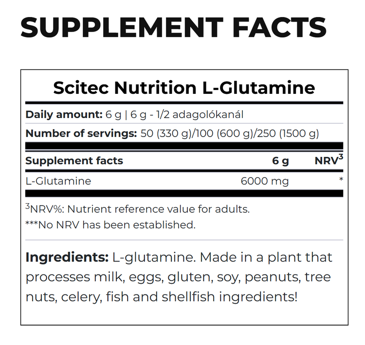 ترکیبات: ال-گلوتامین. ساخته شده در گیاهی که شیر، تخم مرغ، گلوتن، سویا، بادام زمینی، آجیل درختی، کرفس، ماهی و صدف را فرآوری میکند!
