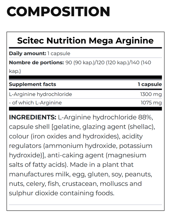 ترکیبات: ۸۸٪ ال-آرژنین هیدروکلراید، پوسته کپسول [ژلاتین، عامل لعابدهنده (شلاک)، رنگ (اکسیدها و هیدروکسیدهای آهن)، تنظیمکنندههای اسیدیته (هیدروکسید آمونیوم، هیدروکسید پتاسیم)]، عامل ضد کلوخه شدن (نمکهای منیزیم اسیدهای چرب). ساخته شده در کارخانهای که شیر، تخممرغ، گلوتن، سویا، بادامزمینی، آجیل، کرفس، ماهی، سختپوستان، نرمتنان و غذاهای حاوی دیاکسید گوگرد تولید میکند.
