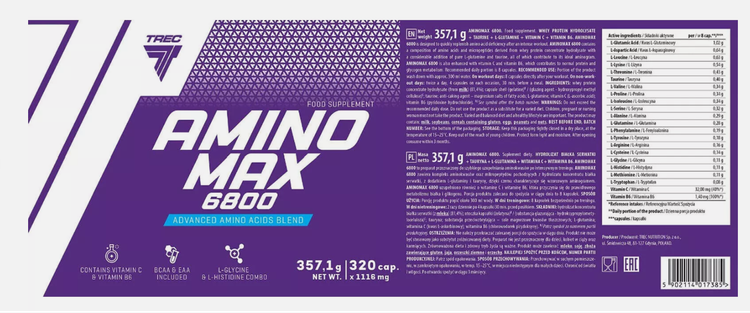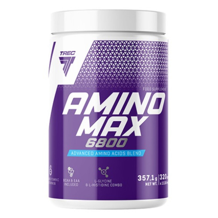 آمینو مکس ۶۸۰۰ TREC ترکیبی از اسیدهای آمینه درونزا و برونزا است که با تورین، ویتامینها و ال-گلوتامین غنی شده است. اسیدهای آمینه موجود در این محصول از هیدرولیزات ایزوله آب پنیر به دست میآیند و به همین دلیل فراهمی زیستی بالایی دارند. این محصول به شکل کپسول است که مصرف روزانه را تسهیل کرده و اندازهگیری دقیق وعده غذایی را امکانپذیر میسازد. آمینو مکس به سرعت و با اطمینان کمبود اسیدهای آمینه را پس از تمرینات شدید و به دلیل کمبود پروتئین در رژیم غذایی روزانه شما جبران میکند. این محصول به افزایش قدرت و استقامت بدن کمک میکند و پس از تمرین روند بازسازی را تسریع میبخشد .