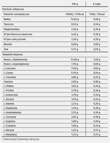 اسید ال-گلوتامیک ۱.۰۲ گرم اسید ال-آسپارتیک ۰.۶۴ گرم ال-لوسین ۰.۶۳ گرم ال-لیزین ۰.۵۴ گرم ال-ترئونین ۰.۴۳ گرم تورین ۰.۴۰ گرم ال-والین ۰.۳۴ گرم ال-پرولین ۰.۳۴ گرم ال-ایزولوسین ۰.۳۴ گرم ال-سرین ۰.۳۲ گرم ال-آلانین ۰.۲۹ گرم ال-گلوتامین ۰.۲۸ گرم ال-فنیلآلانین ۰.۱۹ گرم ال-تیروزین ۰.۱۸ گرم ال-آرژنین ۰.۱۶ گرم ال-سیستئین ۰.۱۴ گرم ال-گلیسین ۰.۱۱ گرم ال-هیستیدین ۰.۱۱ گرم ال-متیونین ۰.۱۱ گرم ال-تریپتوفان ۰.۰۸ گرم ویتامین. ویتامین С 32.00 میلیگرم (40٪*) ویتامین В6 1.40 میلیگرم (100٪*)