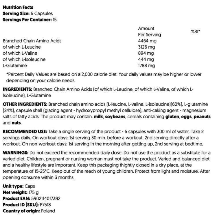 ترکیبات: اسیدهای آمینه شاخهدار (ال-لوسین؛ ال-والین؛ ال-ایزولوسین) (60%)؛ ال-گلوتامین (24%)؛ پوسته کپسول (ژلاتین؛ رنگ - دی اکسید تیتانیوم) عامل ضد کلوخه شدن - نمکهای منیزیم اسیدهای چرب.