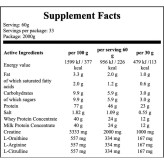 کنسانتره پروتئین وی (شیر) (40%)، کنسانتره پروتئین شیر (40%)، کراتین مونوهیدرات (3.8%)، غلیظ کننده (سدیم کربوکسی متیل سلولز)، ال-اورنیتین ال-آسپارتات (1.1%)، طعم دهنده، سدیم کلرید، ال-آرژنین آلفا کتوگلوت.آرات (0.8%)، ال-سیترولین (0.6%)، شیرین کننده (سوکرالوز)