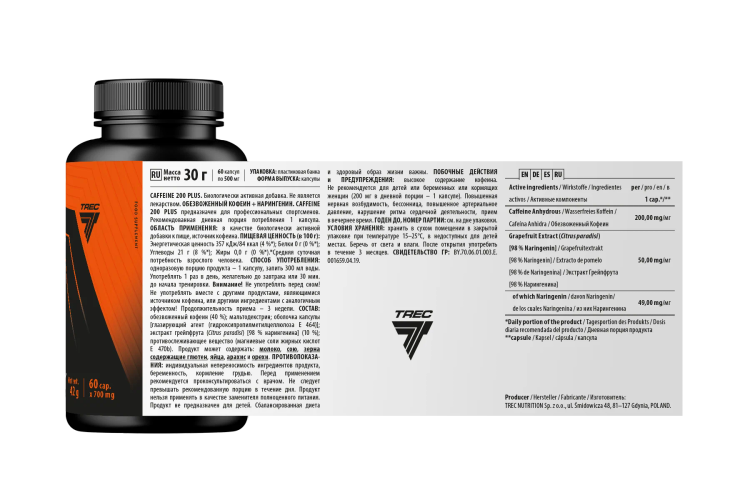 ترکیبات: مالتودکسترین؛ کافئین بدون آب (28.6%)؛ پوسته کپسول (ژلاتین، رنگها - دی اکسید تیتانیوم، اکسید آهن و هیدروکسید)؛ عصاره گریپ فروت (مرکبات) [98% نارینژنین] (7.2%)؛ عامل ضد کلوخه شدن - نمکهای منیزیم اسیدهای چرب.