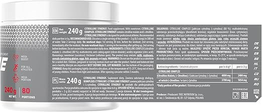 کمپلکس سیترولین ([سیترولین مالات، ال-سیترولین]، از جمله ال-سیترولین)، [سیترولین مالات، ال-سیترولین]، از جمله ال-سیترولین، کمپلکس سیترولین [سیترولین مالات؛ ال-سیترولین) (80.0%)؛ مالتودکسترین؛ آنتی ایمپاسیکوم - دی اکسید سیلیکون؛ تنظیم کننده ادرار - سیترون اسیدی؛ طعم دهنده ها؛ شیرین کننده - آلوزالک؛ غلیظ کننده - صمغ سلولز.