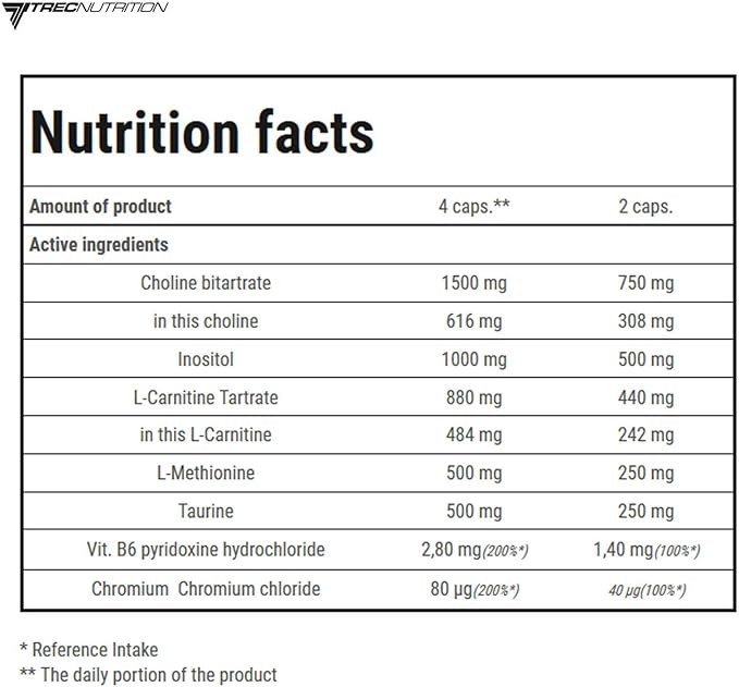 مواد لازممقدار در هر وعده: کولین بی تارترات ۷۵۰.۰۰ میلیگرم، از جمله کولین ۳۰۸.۰۰ میلیگرم، اینوزیتول ۵۰۰.۰۰ میلیگرم، ال-کارنیتین تارترات ۴۴۰.۰۰ میلیگرم، از جمله ال-کارنیتین ۲۹۹.۰۰ میلیگرم، ال-متیونین ۲۵۰.۰۰ میلیگرم، تورین ۲۵۰.۰۰ میلیگرم، ویتامین B6 ۱.۴۰ میلیگرم (۱۰۰٪*)، کروم ۴۰.۰۰ میکروگرم (۱۰۰٪*)، انتقالدهنده چربی، سایر ترکیبات: کولین بی تارترات (۲۸.۶٪)؛ اینوزیتول (۱۹.۱٪)؛ ال-کارنیتین تارترات (۱۶.۸٪)؛ ال-متیونین (۹.۵٪)؛ تورین (۹.۵٪)؛ پوسته کپسول (ژلاتین؛ رنگ - دی اکسید تیتانیوم)؛ عامل ضد کلوخه شدن - نمکهای منیزیم اسیدهای چرب؛ ویتامین B6 (پیریدوکسین هیدروکلراید) (۰.۰۵٪)؛ کروم (پیکولینات کروم) (0.01%).