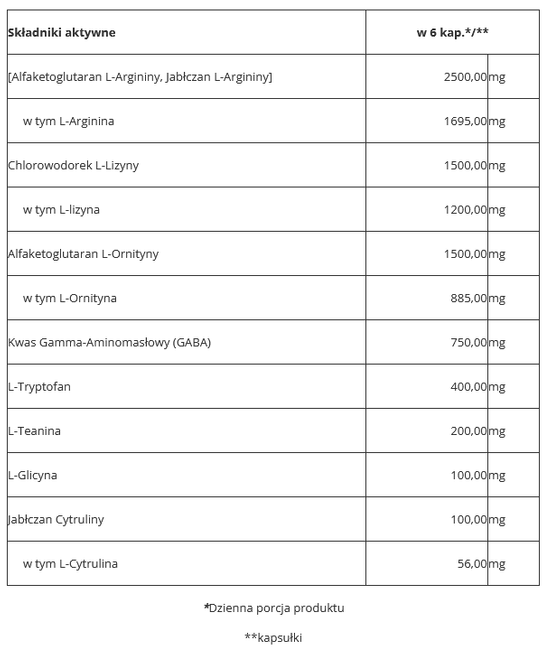 ترکیبات: ال-آرژنین آلفاکتوگلوتارات؛ ال-لیزین هیدروکلراید؛ ال-اورنیتین آلفاکتوگلوتارات؛ ال-آرژنین مالات؛ پوسته کپسول (ژلاتین؛ رنگها - اکسیدها و هیدروکسیدهای آهن، دی اکسید تیتانیوم)؛ گاما آمینوبوتیریک اسید (GABA)؛ ال-تریپتوفان؛ عامل ضد کلوخه شدن - نمکهای منیزیم اسیدهای چرب؛ ال-تیانین؛ ال-گلیسین؛ سیترولین مالات.