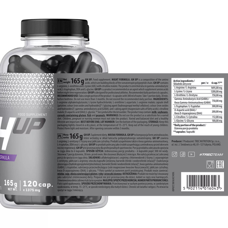 فرمول شبانه Trec GH UP ترکیبی از اسیدهای آمینه است که بلوکهای سازنده زنجیره پلیپپتیدی سوماتوتروپین هستند. Trec GH UP حاوی ال-آرژنین، ال-اورنیتین و ال-لیزین (AOL) به همراه سیترولین مالات است. این محصول همچنین با ال-تیانین، ال-تریپتوفان، ال-گلیسین و ال-گلوتامین غنی شده است. GH UP محصولی است که به عنوان مکمل اسیدهای آمینه قبل از بازسازی در شب توصیه میشود.