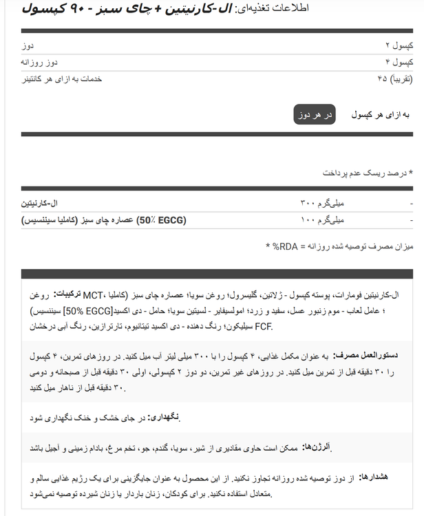 مکمل ال-کارنیتین + چای سبز ، محصولی پیچیده حاوی ال-کارنیتین مایع و عصاره چای سبز غلیظ در کپسولهای ژلی است که به راحتی بلعیده میشوند و قابلیت جذب بالایی دارند.