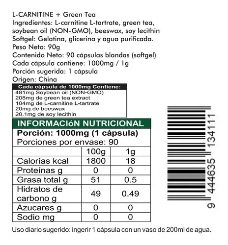 ال-کارنیتین مادهای است که به طور طبیعی توسط کبد، کلیهها و مغز ما از لیزین و متیونین تولید میشود. در میان سایر وظایف، به عنوان یک ناقل عمل میکند که به اسیدهای چرب موجود در خون اجازه میدهد وارد میتوکندری شوند، جایی که متابولیزه شده و به عنوان منبع انرژی استفاده میشوند. ال-کارنیتین + چای سبز حاوی ۲۰۰ میلیگرم از این ماده است.