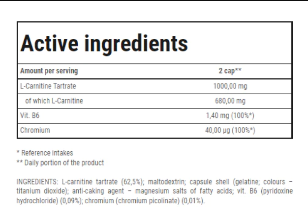 ترکیبات: ال-کارنیتین تارترات (۶۲.۵٪)؛ مالتودکسترین؛ پوسته کپسول (ژلاتین؛ رنگها - دی اکسید تیتانیوم)؛ عامل ضد کلوخه شدن - نمکهای منیزیم اسیدهای چرب؛ ویتامین B6 (پیریدوکسین هیدروکلراید) (۰.۰۹٪)؛ کروم (کروم پیکولینات) (۰.۰۱٪).