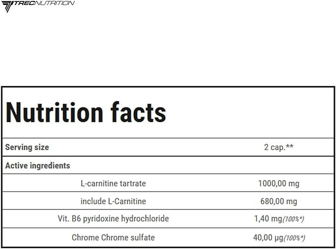 محصول برند TREC یک مکمل غذایی با کیفیت بالا است که حاوی ال-کارنیتین میباشد. این محصول به طور کامل از بدن در فرآیند کاهش وزن پشتیبانی میکند. علاوه بر این، به طور جامع از متابولیسم چربی پشتیبانی میکند و سوزش را در ناحیه بافت چربی، عضلات اسکلتی و سلولهای قلب تحریک میکند. همچنین میتواند تأثیر مثبتی بر کاهش اندازه دور کمر در نواحی مشکلساز بدن مانند قسمت داخلی رانها داشته باشد.