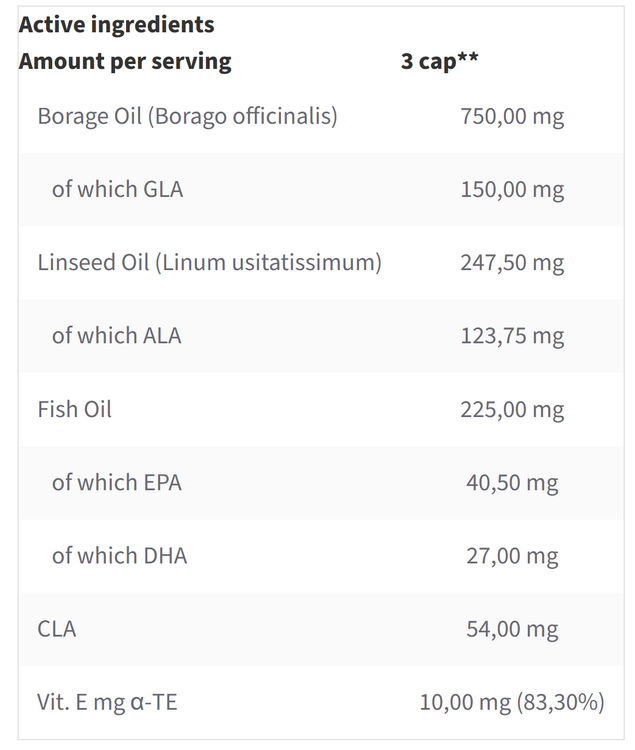 ترکیبات: روغن گل گاوزبان (Borago officinalis) [20% GLA (گاما-لینولئیک اسید)]؛ پوسته کپسول (ژلاتین، عامل سفت کننده - گلیسرول)؛ روغن آفتابگردان؛ روغن دانه کتان (Linum usitatissimum) [50% ALA (آلفا-لینولنیک اسید)]؛ روغن ماهی [18% EPA (ایکوزاپنتانوئیک اسید)، 12% DHA (دوکوزاهگزانوئیک اسید)]؛ CLA (لینولئیک اسید کونژوگه)؛ ویتامین E (D-آلفا-توکوفرول).