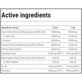 عصاره قهوه سبز (Coffea canephora) [50% ACG]، از جمله ACG، L-تیروزین، عصاره گوارانا (Paullinia cupana) [22% کافئین]، محتوای کل کافئین، اسید پانتوتنیک، عصاره فلفل سیاه (Piper nigrum) [95% پیپرین]، از جمله پیپرین، ویتامین B6، کروم، عصاره قهوه سبز (Coffea canephora) [50% ACG]؛ L-تیروزین؛ عصاره گوارانا (Paullinia cupana) [22% کافئین]؛ پوسته کپسول (ژلاتین؛ رنگها - اکسیدها و هیدروکسیدهای آهن؛ دی اکسید تیتانیوم؛ آزوروبین)؛ کافئین بدون آب؛ عامل ضد کلوخه شدن - نمکهای منیزیم اسیدهای چرب؛ اسید پانتوتنیک (کلسیم D-پانتوتنات)؛ عصاره فلفل سیاه (Piper nigrum) [95% پیپرین]؛ ویتامین B6 (پیریدوکسین هیدروکلراید)؛ کروم (کروم پیکولینات).