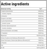 ال-آرژنین، ال-گلوتامین، دی-آسپارتیک اسید، ال-لیزین، ال-اورنیتین، ال-تریپتوفان، منیزیم، عصاره ریشه سنبل الطیب، عصاره برگ بادرنجبویه، ال-تیانین، روی، ویتامین B6