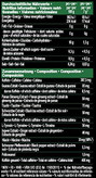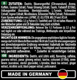 - ترکیبات: دکسترین، اسیدساز (اسید سیتریک)، طعمدهنده، کافئین، عصاره گوارانا، عصاره جینسینگ پاناکس، تورین، رنگ (E150d)، شیرینکننده (سوکرالوز، گلیکوزیدهای استویول)، ال-تیروزین، عصاره چای سیاه، عصاره زنجبیل، اسید نیکوتینیک، عصاره فلفل سیاه، پلیکوزانول