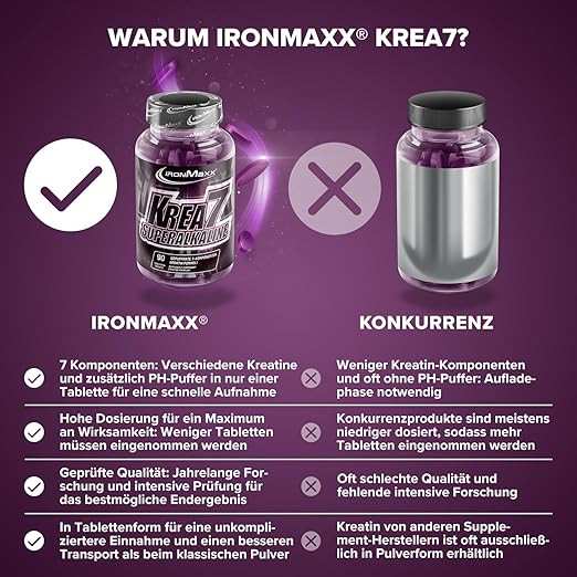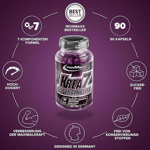 - ۷ برابر کراتین در یک فرمول: قرصهای کراتین سوپرآلکالاین IronMaxx Krea7 حاوی ۷ نوع کراتین برای هر کسی است که میخواهد آهن (Maxximum) را از بدن خود خارج کند. کربنات سدیم به عنوان یک بافر pH در طول تمرینات قدرتی عمل میکند.