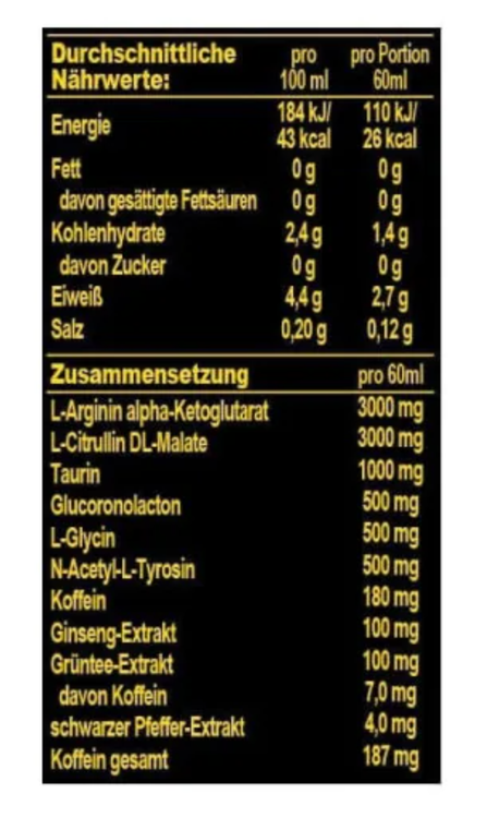 ترکیبات: آب، ال-سیترولین دیال مالات، ال-آرژنین آلفا-کتوگلوتارات، تورین، طعمدهنده، دی-گلوکورونولاکتون، گلیسین، ان-استیل-ال-تیروزین، کافئین، نگهدارنده (بنزوات سدیم، سوربات پتاسیم)، عصاره چای سبز، عصاره جینسینگ، غلیظکننده (صمغ زانتان)، اسیدیکننده (سیتروننز). ۱) تنظیمکننده ارگاسم (هیدروکسید سدیم)، شیرینکننده (سوکرالوز، استویول گلیکوزیدهای استویا)، عصاره فلفل سیاه. * بدون قند