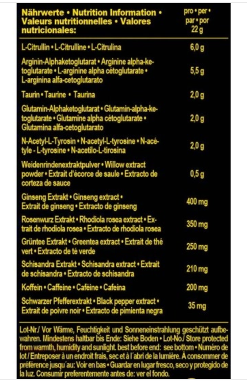ترکیبات بهینه و هماهنگ، حداکثر تأثیر را تضمین میکنند. حاوی طیف کاملی از اسیدهای آمینه مهم به همراه حداکثر ۲۰۰ میلیگرم کافئین، بدون کراتین با عصارههای گیاهی طبیعی. بهینه شده با سیترولین، آرژنین AAKG و گلوتامین.