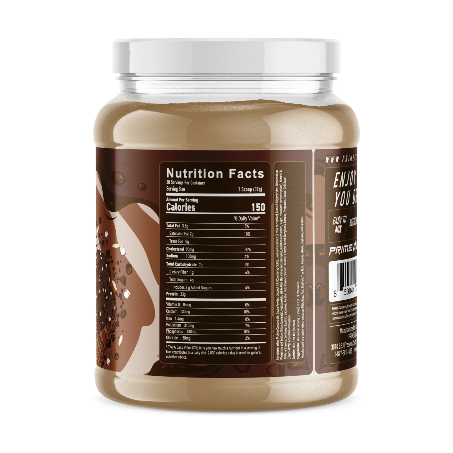 کنسانتره پروتئین وی ، تکههای بیسکویت شکلاتی (آرد غنیشده سفید نشده (آرد گندم، نیاسین، آهن ، تیامین مونونیترات [ویتامین B1]، ریبوفلاوین [ویتامین B2]، اسید فولیک)، شکر، پالم و/یا روغن کانولا ]، شربت ذرت با فروکتوز بالا، جوش شیرین و/یا فسفات کلسیم، نمک، لسیتین سویا، شکلات، طعم مصنوعی، پلیمرهای گلوکز، روغن نارگیل (جامدات شربت ذرت، کازئینات سدیم (مشتقات شیر)، مونو و دی گلیسریدها، فسفات دی پتاسیم و سیلیکوم آلومینات سدیم)، پودر کاکائو، پودر آرد بادام زمینی، طعم دهنده های طبیعی، صمغ زانتان، سوکرالوز، کلرید سدیم، دیج SEB™ (آمیلاز، لاکتاز، پروتئازها، لیپاز، سلولاز)، اسیدآفتاب گردان، گلاسه آفتابگردان.