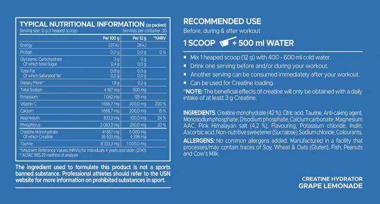ترکیبات: کراتین مونوهیدرات، تورین، منیزیم بیس گلیسینات، تنظیمکنندههای اسیدیته (اسید سیتریک، اسید مالیک)، دیپتاسیم فسفات، تریکلسیم فسفات، نمک دریایی صورتی هیمالیا، کلرید پتاسیم، طعمدهنده، ویتامین C (اسید اسکوربیک)، پلیدکستروز، شیرینکنندهها (آسهسولفام K، سوکرالوز)، غلیظکننده (صمغ سلولز)، کنسانتره آب هویج سیاه، AstraGin® (عصاره ریشه Astragalus Membranaceous و Panax Notoginseng)، دارچین (Cinnamomum zeylanicum)، عامل ضد کلوخه شدن (دیاکسید سیلیکون)، طعمدهنده طبیعی. آلرژنها: هیچ آلرژن رایجی اضافه نشده است. ممکن است حاوی مقادیر کمی از آجیل (از جمله بادام زمینی)، شیر، سویا، گلوتن، تخممرغ، ماهی، سختپوستان و سولفیتها باشد.