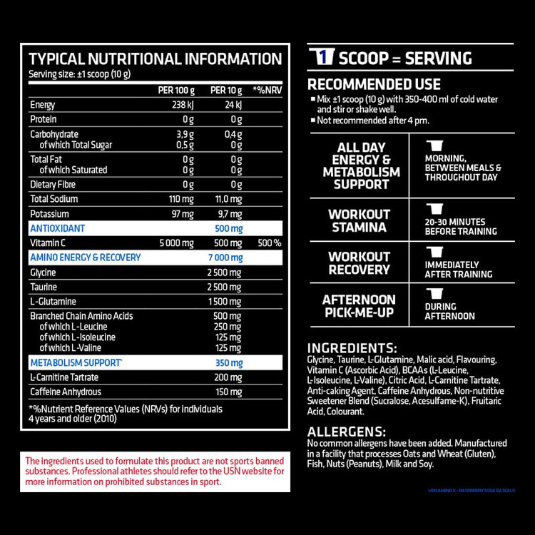 آمینو X یو اس ان یک آمینو ترکیبی شامل امینو اسید ها و کافئین همچنین الکارنتین است که عولاوه بر تامین آمینو اسید های مورد نیاز عضلات ، سطح انرژی شما را افزایش میدهد و روند چربی سوزی را تسریع میکند
