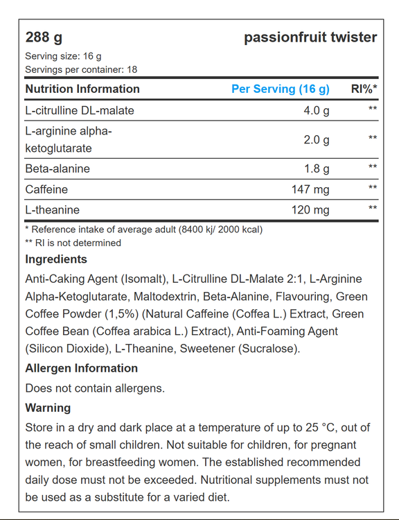 | عامل ضد کلوخه شدن (ایزومالت)، ال-سیترولین دیال-مالات ۲:۱، ال-آرژنین آلفا-کتوگلوتارات، مالتودکسترین، بتا-آلانین، طعمدهنده، پودر قهوه سبز (۱.۵٪) (عصاره کافئین طبیعی (کافئا ال.)، عصاره دانه قهوه سبز (کافئا عربیکا ال.)، عامل ضد کف (دیاکسید سیلیکون)، ال-تیانین، شیرینکننده (سوکرالوز). | |||