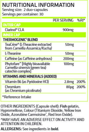 فدرا کات لیپو ایکس تی یک چربی سوز چند منظوره دو فاز بهینه شده است که مواد مغذی حیاتی را در زمان بهینه آزاد میکند، بنابراین میتوانید مطمئن باشید که در حین کار بر روی تغییر کامل بدن خود، از مزایای کامل آن بهرهمند خواهید شد. درب بیرونی حاوی ۹۰۰ میلیگرم کلارینول سی ال ای (اسید لینولئیک مزدوج) است و حدود ۲ ساعت بعد، از مزایای درب داخلی، از جمله تیاکرین، کافئین و چای سبز، بهرهمند خواهید شد. این فناوری منحصر به فرد چند فازی، تحویل سریع کپسول مایع (به عنوان سی ال ای) را با فناوری کپسول داخلی ترکیب میکند. این فناوری همچنین با استفاده از یک سیستم کپسوله سازی ثانویه، حداکثر محافظت را برای مواد حساس فراهم میکند. فدرا کات لیپو ایکس تی مزایای زیر را ارائه میدهد: چای سبز - حاوی فیتوفار، یک کمپلکس کاتچین چای سبز، برای پشتیبانی از متابولیسم و اکسیداسیون چربی شما. ترموژنیک - خود چای سبز آنزیمی را که در ترموژنز چربی بدن نقش دارد، مهار میکند، که برای کسانی که به دنبال کاهش وزن اضافی هستند، این میتواند حیاتی باشد. ویتامین B6 - سوخت و ساز انرژیزای شما را افزایش میدهد و به شما کمک میکند تا از هر جلسه تمرینی بیشترین بهره را ببرید. کروم - از حفظ سطح طبیعی گلوکز خون و متابولیسم درشت مغذیها پشتیبانی میکند. کافئین - برای تقویت بیشتر در حین تمرین. نحوه مصرف توصیه شده: دو بار در روز، هر بار ۱ کپسول یا یک بار ۲ کپسول، یک بار صبح، قبل از صبحانه یا تمرین صبحگاهی مصرف کنید. اگر برای خوابیدن مشکل دارید، بعد از ساعت ۴ بعد از ظهر از مصرف خودداری کنید. ۵ روز متوالی در هفته مصرف کنید و قبل از ادامه مصرف (۲ روز استراحت)، به مدت ۲ روز مصرف را قطع کنید. اطلاعات تغذیهای اندازه هر وعده: ۲ کپسول دوتایی Clarinol® CLA: ۹۰۰ میلیگرم TeaCrine® (ال-تئاکرین استخراج شده از Camellia Assamica/Kucha): ۵۰ میلیگرم L-Theanine: ۵۰ میلیگرم کافئین (به صورت کافئین بیآب): ۲۰۰ میلیگرم Phytofare™ [کمپلکس کاتچین Camellia sinensis (چای سبز) با زیستفراهمی بالا}: ۱۰۰ میلیگرم ویتامین B6 (به صورت پیریدوکسین HCl): ۲.۸ میلیگرم (۲۰۰٪ RI*) کروم (به صورت کروم پیکولینات): ۸۰ میکروگرم (۲۰۰٪ RI*) ترکیبات پوسته کپسول: ژلاتین ماهی، هیپروملوز، رنگ (دیاکسید تیتانیوم، اکسید آهن زرد، آزوربین کارموزین، اکسید آهن قرمز). اطلاعات آلرژن هیچ آلرژن رایجی اضافه نشده است، اما حاوی ماهی است.