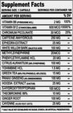 - عصاره یوهیمب (Pausinystalia Yohimbe) (پوست درخت) ۸٪ یوهیمبین ۱۹ میلیگرم: ممکن است انرژی را افزایش داده و اشتها را کاهش دهد.† به چربیهای ذخیره شده در قسمت پایین شکم و پهلوها حمله میکند.†