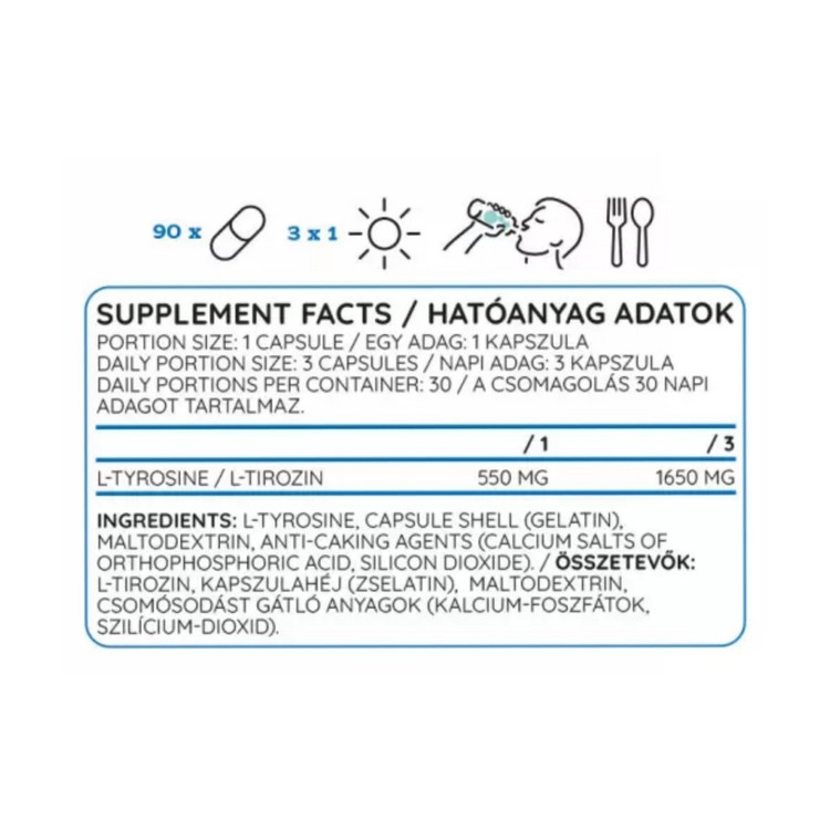 ترکیبات : ال-تیروزین، پوسته کپسول (ژلاتین)، مالتودکسترین، عوامل ضد کلوخه شدن (نمکهای کلسیم اسید ارتوفسفریک، دی اکسید سیلیکون).