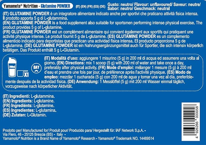 پودر گلوتامین، مکملی از شرکت یاماموتو نوتریشن است که بر اساس پودر ال-گلوتامین خالص، که از طریق فرآیندهای تخمیر گیاهی به دست میآید، تولید شده است. پودر گلوتامین برای ورزشکارانی که در فعالیتهای بدنی که نیاز به تلاش شدید عضلانی دارند، شرکت میکنند، مناسب است.