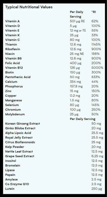 - ترکیبات: دی کلسیم فسفات، عامل حجم دهنده (سلولز میکروکریستالی)، کربنات کلسیم ( نشاسته گندم )، ال-کولین بی تارترات، اینوزیتول، اکسید منیزیم، ویتامین C، عوامل لعاب دهنده (هیدروکسی پروپیل متیل سلولز، تالک)، مرطوب کننده (گلیسرول)، ویتامین E، آلفا لیپوئیک اسید، نیاسین، پودر جلبک دریایی ( آسکوفیلوم نودوسوم )، اسید پانتوتنیک، اکسید روی، بتا کاروتن، عامل ضد چسبندگی (منیزیم استئارات)، عصاره آناناس ( آناناس کاموسوس ) (حاوی بروملین)، عصاره هسته انگور ۱۲۰:۱ ( ویتیس وینیفرا )، عصاره برگ گزنه ۴:۱ ( گزنه )، ویتامین B6، عصاره گل همیشه بهار ( تاژتس ارکتا ) (حاوی لوتئین)، ویتامین B1، ویتامین B2، سولفات منگنز، A-آمیلاز ( آرد گندم )، سولفات مس، لیپاز، پاپائین، اسید فولیک، کلرید کروم، سلنومتیونین، بیوتین، مولیبدات سدیم، ویتامین K1، ویتامین B12، ویتامین D3.