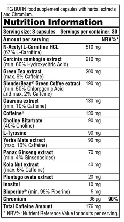 مکمل NRG Burn شرکت Galvanize Nutrition یک فرمول پیشرفته برای کاهش وزن و چربی با ۱۵ ماده فعال مانند: N-استیل L-کارنیتین ، گارسینیا کامبوجیا، عصاره چای سبز ، عصاره قهوه سبز ، L-تیروزین، کولین، جینسینگ، کروم، کافئین و غیره است. همچنین حاوی ویتامین B6 است که به متابولیسم طبیعی بدن کمک میکند و باعث تولید انرژی و کاهش خستگی میشود.
