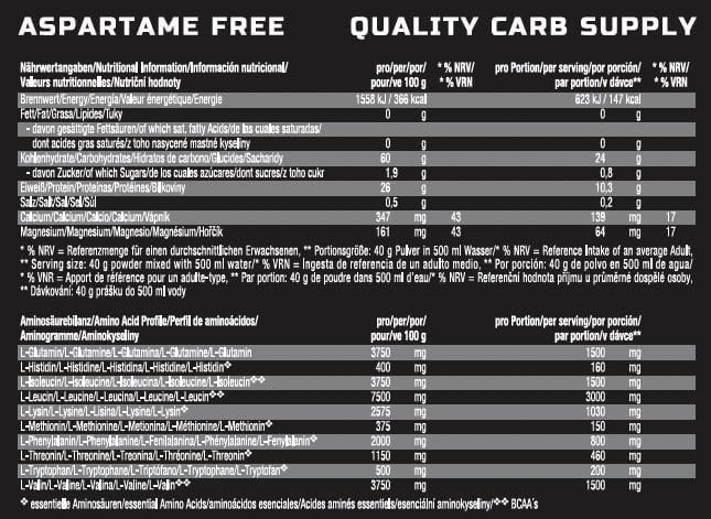 ترکیبات: ۲۲٪ مخلوط اسید آمینه ضروری (۷.۵٪ ال-لوسین، ۳.۷۵٪ ال-ایزولوسین، ۳.۷۵٪ ال-والین، ال-لیزین هیدروکلراید، ال-فنیلآلانین، ال-ترئونین، ال-تریپتوفان، ال-هیستیدین، ال-متیونین)، ۲۲٪ مالتودکسترین ذرت، ۱۹.۶٪ مالتودکسترین سیبزمینی، ۱۹.۴٪ مالتودکسترین ذرت مومی، اسیدکننده: اسید سیتریک؛ ۳.۷۵٪ ال-گلوتامین، تنظیمکننده اسیدیته: دیپتاسیم فسفات؛ کربنات کلسیم، کربنات منیزیم، عطر، کلرید سدیم، رنگ: قرمز چغندر؛ امولسیفایر: لسیتین سویا؛ شیرینکنندهها: آسهسولفام-K، سوکرالوز، استویول گلیکوزیدها. ممکن است حاوی مقادیر کمی شیر، لاکتوز، گلوتن و تخممرغ باشد.