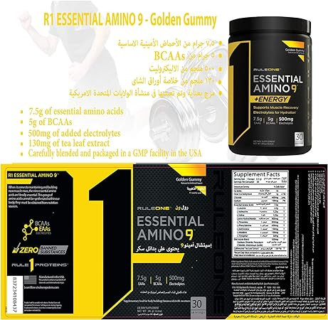 - R1 Essential Amino 9 7.5 گرم از تمام 9 اسید آمینه ضروری را با الکترولیت های اضافه شده برای هیدراتاسیون ارائه می کند.