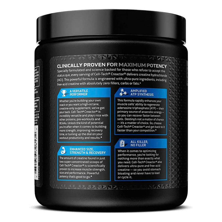 چه بخواهید خودتان را بسازید و چه بخواهید یک مکمل فقط کراتین مصرف کنید، ما در کنار شما هستیم. Cell-Tech® Creactor® فوقالعاده همهکاره است و به خوبی با سایر پرورشها، مکملهای قبل از تمرین و BCAAها میشود. Cell-Tech® Creactor® با نتایج بینظیر علمی، به شما کمک میکند تا رکوردهای شخصی و رکوردهای زمین خود را در باشگاه یا مسابقه بشکنید. در این فرمول، هیچ ماده کلیدی، پرکننده یا شکری با دوز ناکافی وجود ندارد! هر پیمانه Cell-Tech® Creactor® که به طور کامل افشا شده است، قدرت را برای دستیابی به نتایج بدست آمده میکند.