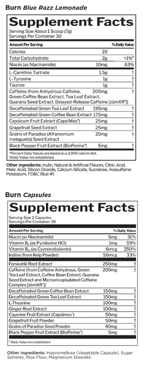 Rule1 Burn سوخت و ساز بدن را افزایش میدهد و از چربیسوزی پشتیبانی میکند. Rule1 Burn که با ترکیبی چشمگیر از عصارههای ترموژنیک، کافئین از منابع مختلف، اسیدهای آمینه و موارد دیگر ساخته شده است، به انرژی روزانه، انگیزه، سوخت و ساز بدن و مدیریت وزن کمک میکند. Burn که به صورت پودرهای آماده یا کپسولهای با کاربرد آسان موجود است، برای انواع برنامههای غذایی و ورزشی مناسب است. این محصول حاوی ترکیبی عالی از مواد ترموژنیک، از جمله ترکیبی از چندین کافئین مشتق شده از دانههای قهوه بدون آب، برگهای چای، دانههای گوارانا و منابع میکروکپسوله شده با رهایش تأخیری است. یک وعده از پودرها یا کپسولها انرژی معادل حدود دو فنجان قهوه قوی را ارائه میدهد.