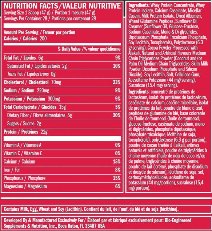 هر وعده SYNTHA-6 یک ماتریس پروتئینی ۲۲ گرمی شامل کنسانتره پروتئین وی، پروتئین وی ایزوله، کازئینات کلسیم، کازئین میسلی، پروتئین شیر ایزوله و آلبومین تخم مرغ فراهم میکند.