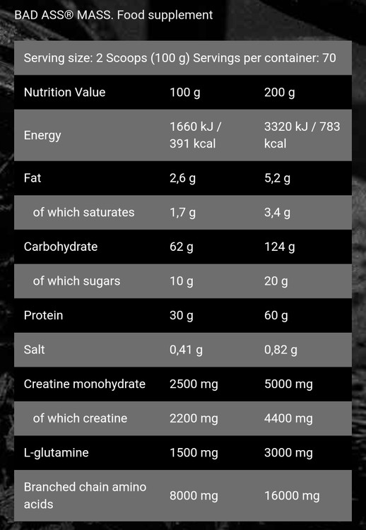 مکمل افزایش حجم بد اَس (BAD ASS MASS Gainer) محصولی است که رژیم غذایی روزانه را با مجموعهای از پروتئینهای کامل و کربوهیدراتها غنی میکند و با مقادیر بهینهای از کراتین مونوهیدرات و ال-گلوتامین تکمیل میشود. فرمول پیشنهادی به عنوان نوعی پشتیبانی در طول عضلهسازی و مدلسازی بدن عضلانی مفید خواهد بود. این محصول به شکل پودری با قابلیت حل آسان تهیه شده است که امکان تهیه یک شیک خوشمزه و مغذی با طعمی باورنکردنی را فراهم میکند. این مکمل برای افرادی که به دنبال منبع مناسبی از کالریهای ارزشمند و مواد مغذی ضروری هستند توصیه میشود - این محصول برای علاقهمندان آماتور و حرفهای به ورزشهای قدرتی و استقامتی توصیه میشود.