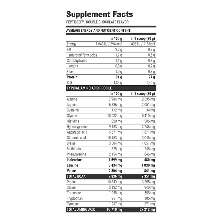 PeptiBeef® پروتئین گوشت گاو هیدرولیز شده است - ایزوله HYDROBEEF® (پپتیدهای گوشت گاو هیدرولیز شده ) که در انتظار ثبت اختراع است و حاوی پروتئین گوشت گاو (تقریباً 25٪) و پروتئین استخوان گوشت گاو (تقریباً 75٪) میباشد. این محصول بالاترین میزان پروتئین گوشت گاو را در بین محصولات مشابه موجود در بازار دارد. این پروتئین هیدرولیز شده است، به این معنی که پپتیدهای آن بسیار سریع هضم و جذب بدن انسان میشوند. تقریباً 15٪ از پپتیدهای موجود در PeptiBeef® دارای جرم مولکولی 6000 Da، 55٪ 3000 Da و 30٪ 500 Da و کمتر از آن هستند که پپتیدهای بسیار کوتاه (و بسیار ارزشمند در تغذیه ورزشی) با جذب و استفاده بسیار خوب هستند. پس از مخلوط کردن، شیک کفدار دریافت میکنید. PeptiBeef® حاوی 91٪ ایزوله گوشت گاو هیدرولیز شده با حداقل چربی است. پروتئین با آنزیمهای بروملین و پاپائین برای استفاده ایدهآل از پروتئین و ساخت آن در عضلات تکمیل شده است. ISOBEEF® همچنین با شیرینکنندهای از گیاه استویا شیرین شده است. مصرف PeptiBeef ® میتواند رشد توده عضلانی را افزایش داده و از کاتابولیسم عضلانی در معرض خطر آن جلوگیری کند.