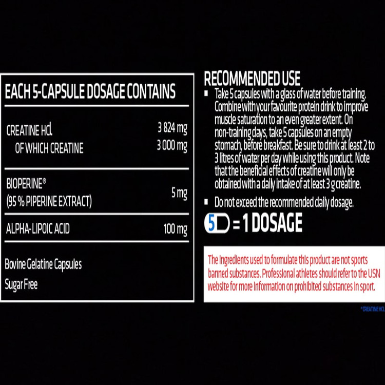 کراتین هیدروکلراید USN حاوی ۳۸۲۴ میلیگرم کراتین هیدروکلراید است که ۳۰۰۰ میلیگرم کراتین (دوز مؤثر و اثباتشده کراتین، صرف نظر از نوع آن) را به همراه دارد. ۸۲۴ میلیگرم دیگر از نمک HCl متصل به مولکول حاصل میشود (که حلالیت را افزایش میدهد). آلفا-لیپوئیک اسید و بیوپرین® به فرمولاسیون اضافه شدهاند تا به انتقال و جذب کراتین تا حد بیشتری کمک کنند.