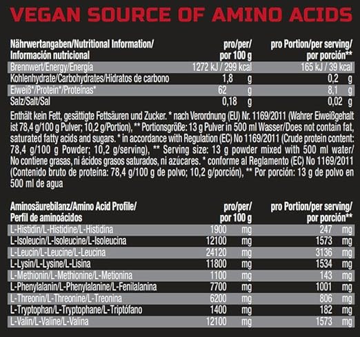 - دوز بالا: هر وعده حاوی 10.2 گرم EAA آزاد از منابع گیاهی است. این پودر وگان حاوی چربی یا قند نیست و آن را به انتخابی ایدهآل برای هر رژیم غذایی تبدیل میکند.