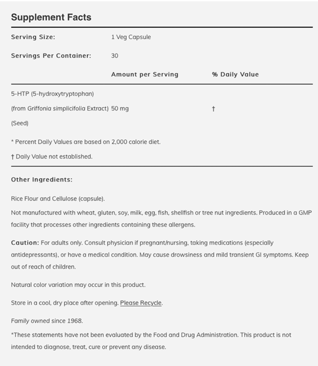 5-HTP، متابولیت واسطه بین اسید آمینه L-تریپتوفان و سروتونین، از دانه یک گیاه آفریقایی (Griffonia simplicifolia) استخراج میشود.*